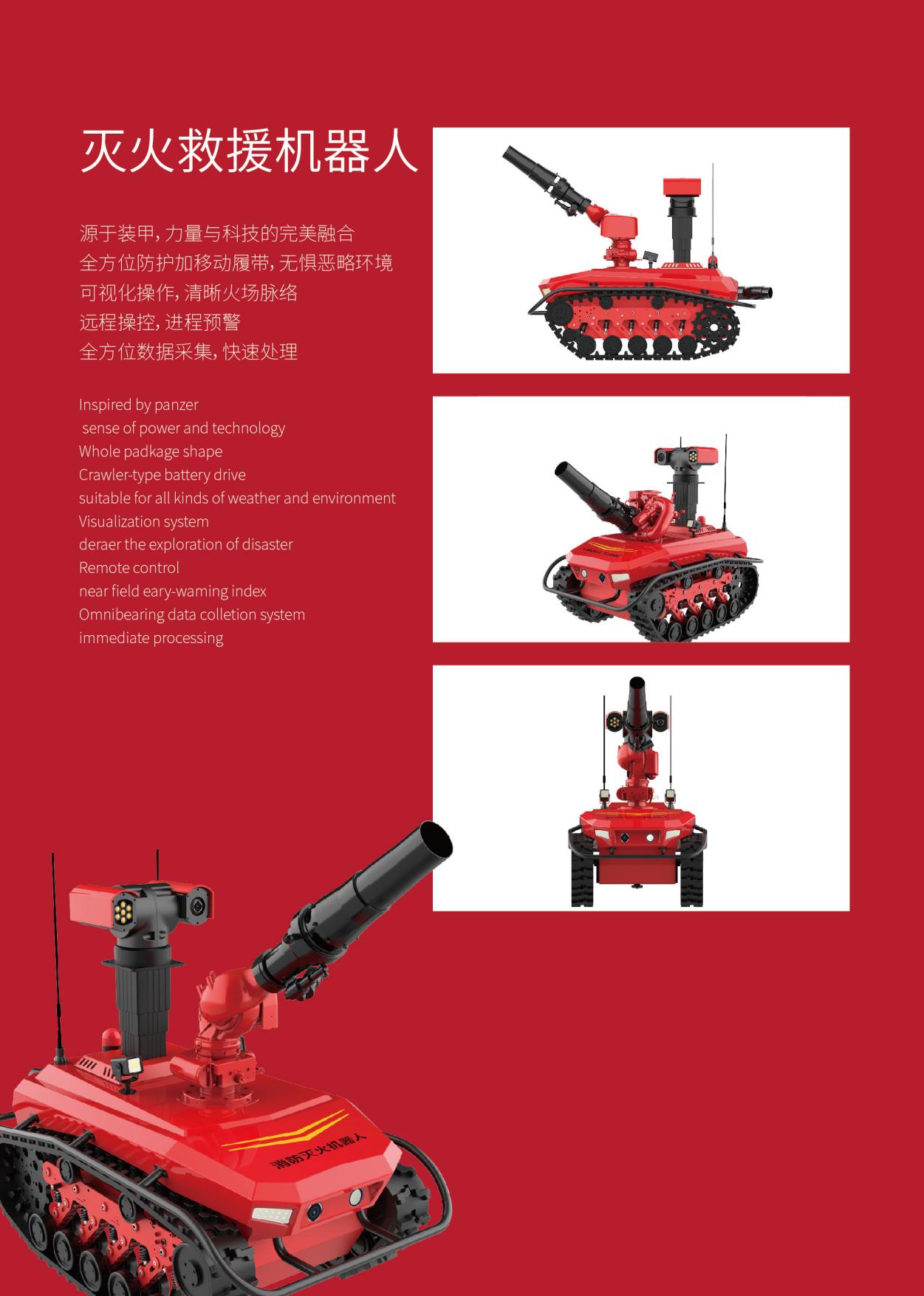 2、全方位防護+移動履帶,可越坡越障,適應各種天氣和工作環境,無懼惡略條件,為消防提供更多的安全保障。