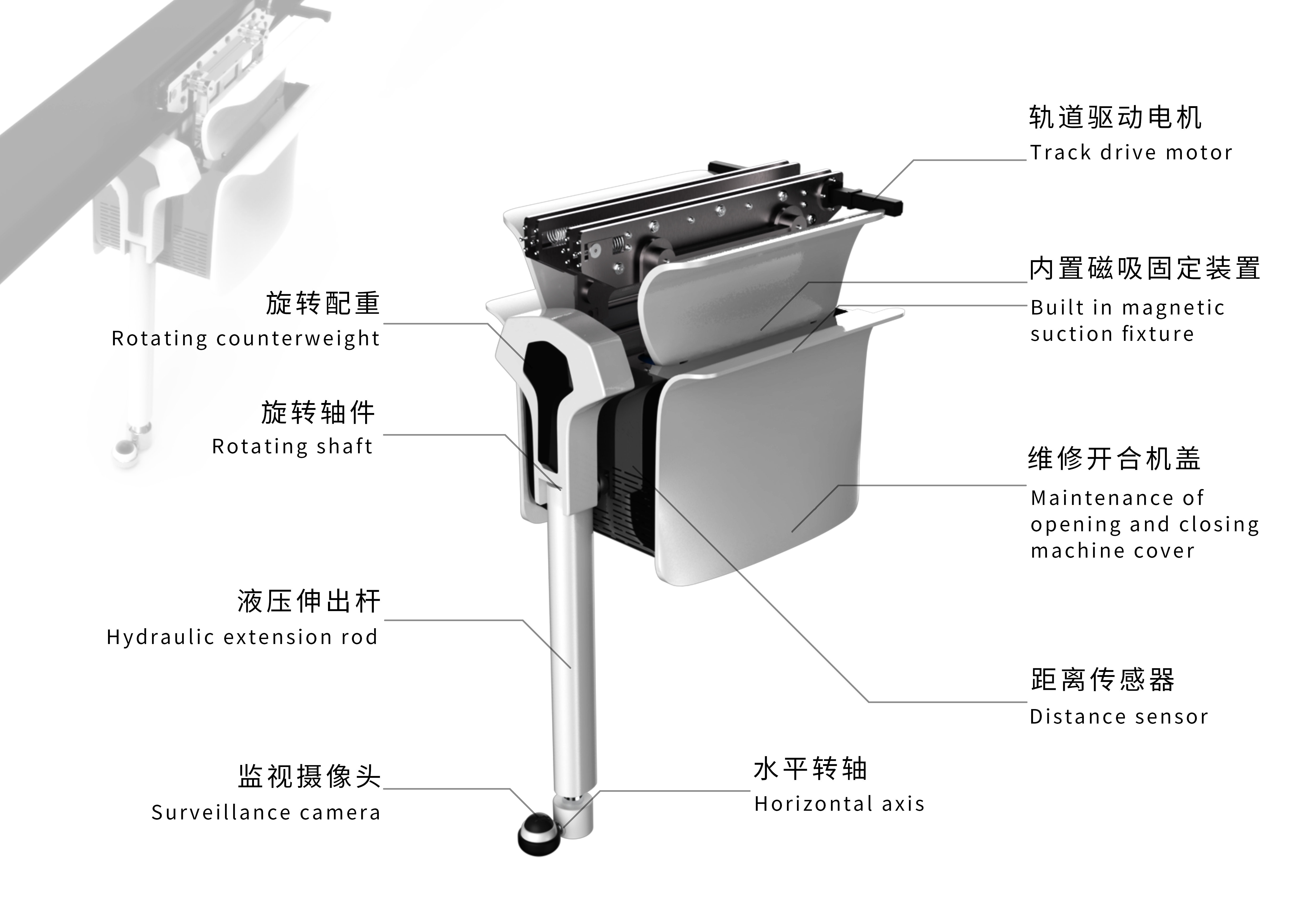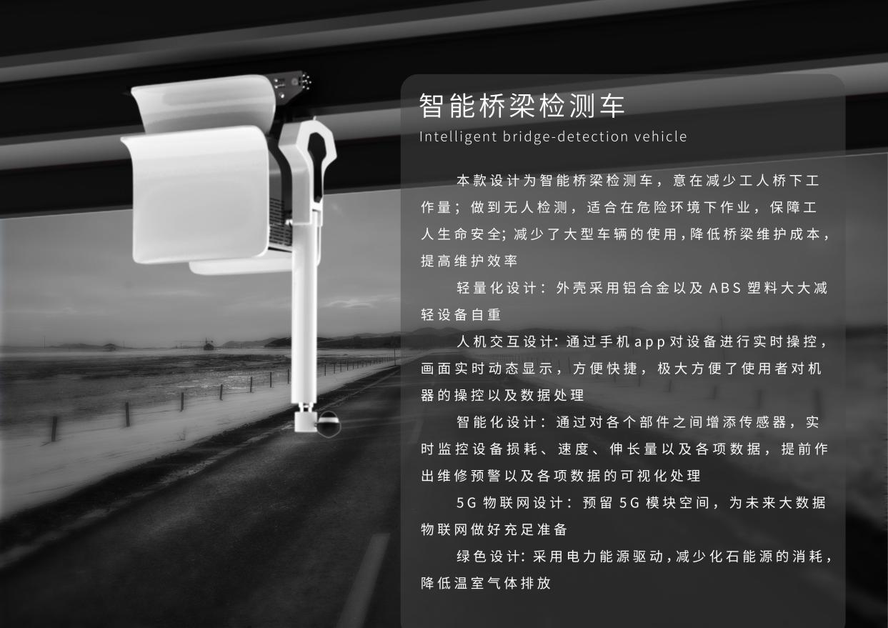本款設計為智能橋梁檢測車,意在減少工人橋下工作量;做到無人檢測,適合在危險環境下作業,保障工人生命安全;減少了大型車輛的使用,降低橋梁維護成本,提高維護效率。