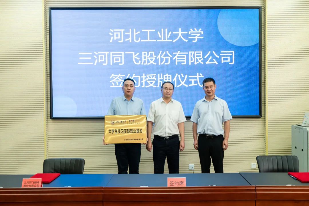 2022年8月1日上午,三河同飛制冷股份有限公司總經理張浩雷與河北工業大學機械工程學院副院長甄東簽署了校企人才培養合作協議,并由河北工業大學國家大學科技園管理中心主任苑光明向同飛股份實習實踐就業基地授牌。三河經濟開發區相關領導、河北工業大學及三河經濟開發區域內部分企業參加了此次活動。