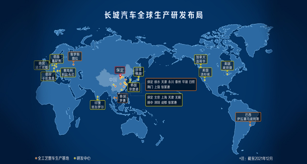 長城汽車股份有限公司是一家全球化智能科技公司,致力服務于全球用戶智能、綠色出行,業務包括汽車及零部件設計、研發、生產、銷售和服務,并在動力電池、氫能、太陽能等清潔能源領域進行全產業鏈布局,積極開展智能網聯、智能駕駛、芯片等前瞻技術的研發和應用。長城汽車在中國、美國、加拿大、德國、奧地利、日本、韓國等國家和地區設立研發中心;在華北、華東、西南、華中布局整車生產,擁有十大全工藝整車生產基地。同時,公司加快“走出去”步伐,在俄羅斯、泰國、巴西建立3個全工藝整車生產基地,在厄瓜多爾、馬來西亞、突尼斯等地擁有5個KD(散件組裝)工廠。公司連續多年入選中國企業500強、中國機械500強、中國民營企業上市公司十強,成為國內優秀的民族汽車品牌之一。長城汽車堅持以用戶為中心,踐行“基于品類創新,以品類建品牌”發展戰略,形成哈弗、魏牌、歐拉、坦克、長城皮卡五大品牌;定位“全球首個溫暖且酷的機甲科技品牌”沙龍于2021年完成全球首秀,率先開創了“機甲科技”全新品類,首款搭新車機甲龍將于年內正式上市;與寶馬集團合資成立的光束汽車也正快速有序推進。今年下半年,長城汽車加快電動化和智能化發展,將陸續推出哈弗H6混動、魏牌圓夢、歐拉閃電貓、朋克貓等多款重磅新品,助力企業進入新一輪快速成長期,加速向“全球化智能科技公司”轉型。