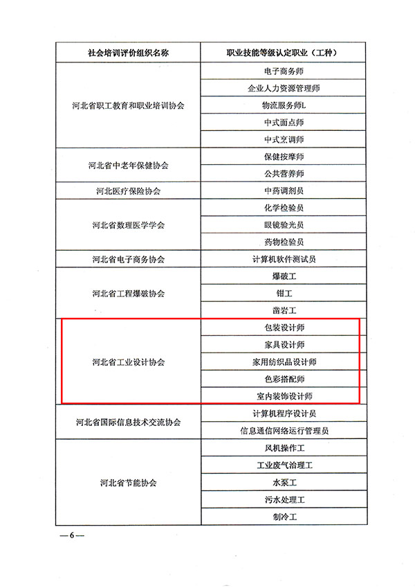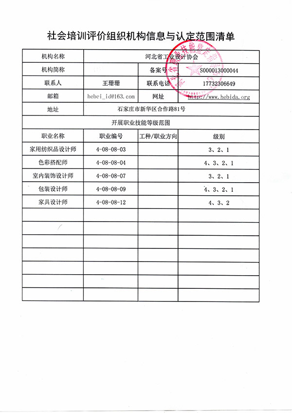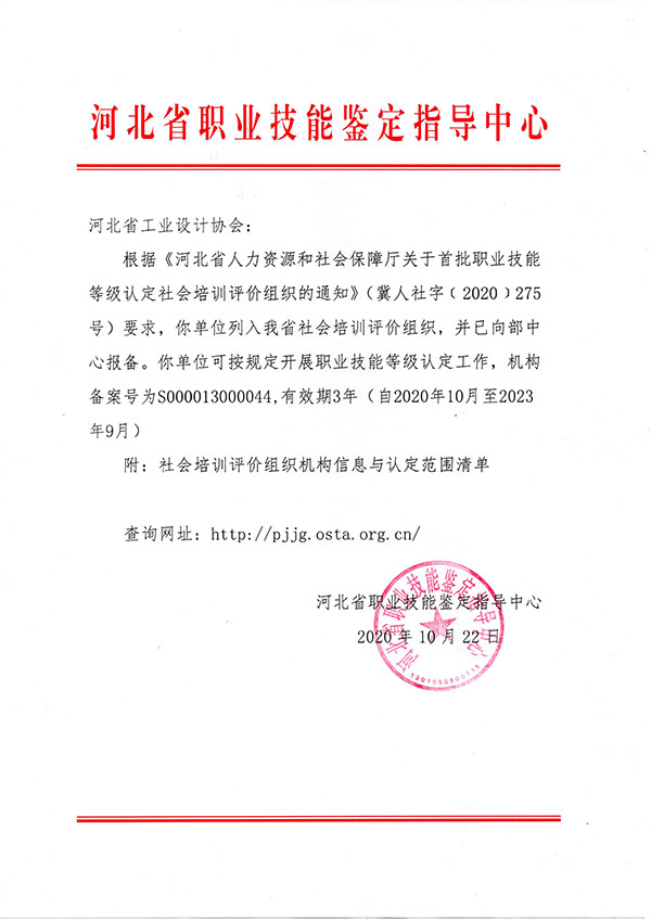 河北省工業(yè)設(shè)計協(xié)會是由河北省人力資源和社會保障廳批準(zhǔn)的河北省首批職業(yè)技能等級認(rèn)定社會培訓(xùn)評價組織和認(rèn)定機(jī)構(gòu),機(jī)構(gòu)備案號為:S000013000044,是開展包裝設(shè)計師、家具設(shè)計師、室內(nèi)裝飾設(shè)計師、家用紡織品設(shè)計師、色彩搭配師等五個職業(yè)技能評價和認(rèn)定的唯一機(jī)構(gòu)。